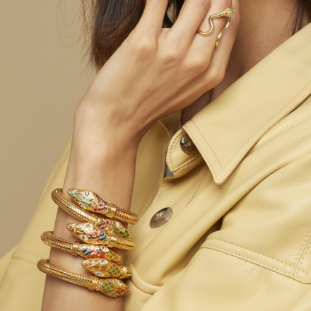 Anillo dorado delicadamente dorado con oro fino de 24 kilates. Los extremos están adornados con la cabeza y la cola de una serpiente. Tamaño ajustable.