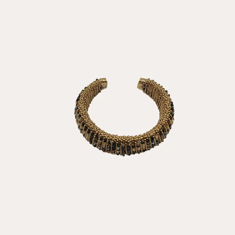 Esta elegante pulsera tipo puño destaca por su diseño cómodo y moderno. Está bañada en oro, con una base compuesta por hilos finos y delicadas cuentas doradas que añaden un toque de brillo. El complemento perfecto lo aportan las perlas en tonos verde, que adornan la pieza con sutileza y estilo. Ideal para quienes buscan un accesorio que combine lujo y originalidad, perfecto tanto para ocasiones especiales como para el día a día. ¡Un detalle que eleva cualquier look!