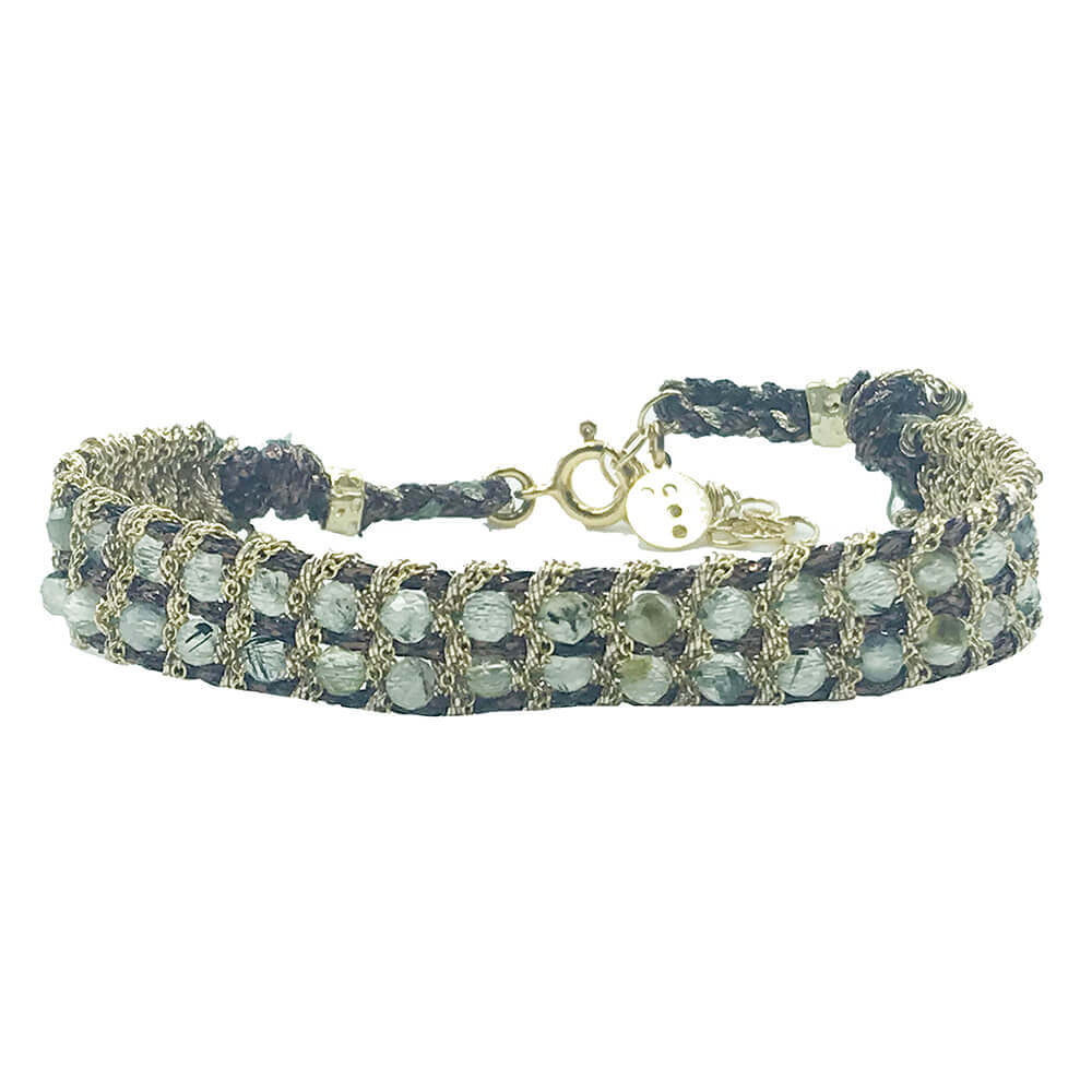 Esta elegante pulsera de dos filas, tejida a mano con malla de plata 925 dorada y lurex, resalta la frescura y suavidad de la prenita, una piedra conocida por su energía armonizante y su color verde delicado. Su diseño refinado combina el lujo de la plata dorada con la serenidad de la piedra, creando un accesorio sofisticado y lleno de estilo.