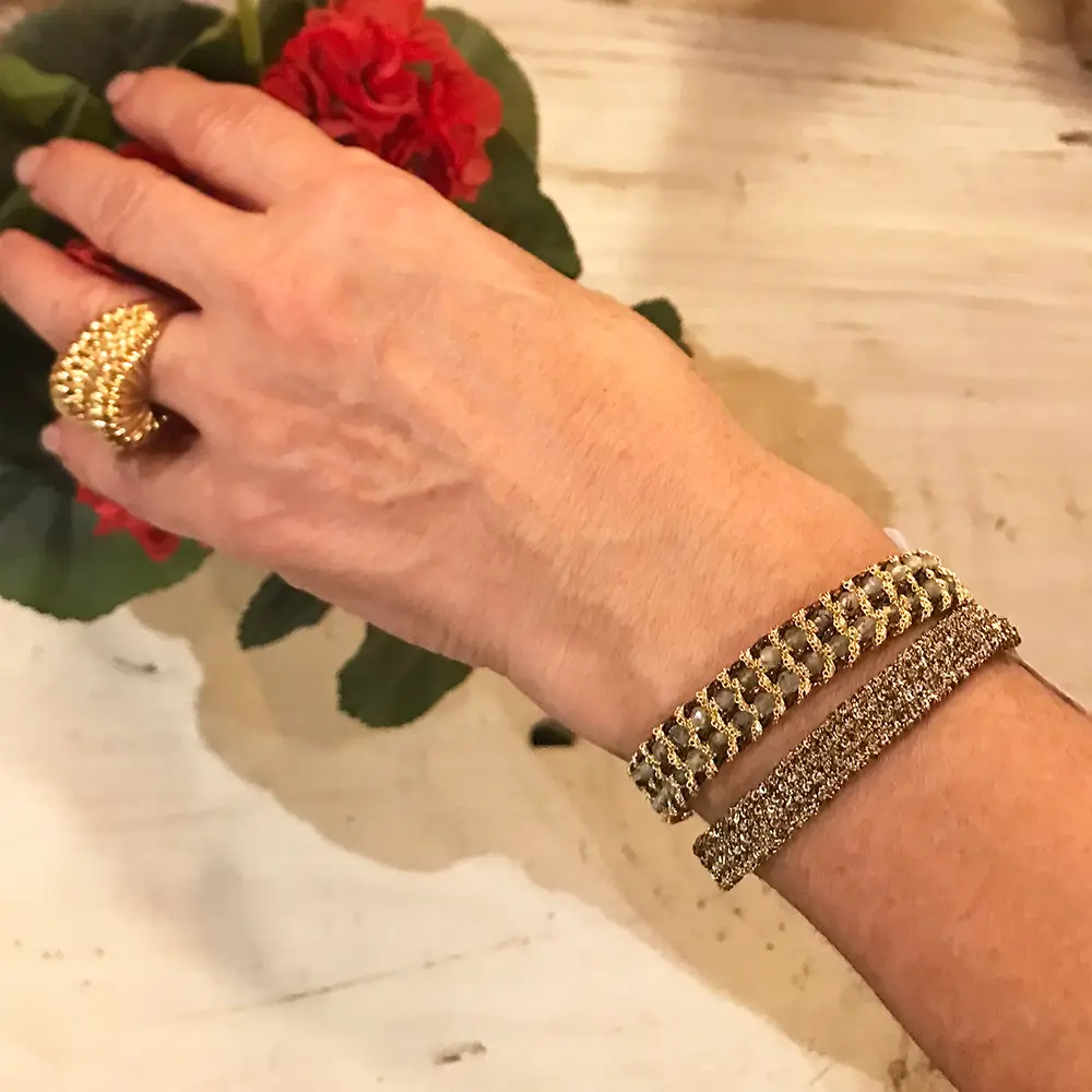 Pulsera artesanal de malla tejida en plata 925 dorada, lurex y prenita