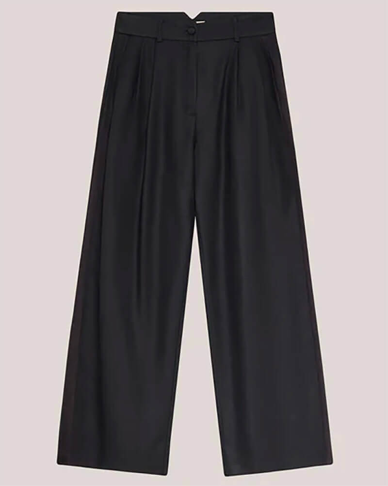 Mezcla de viscosa con corte de pierna ancha y recta, con caída definida. De cintura alta, con cinturilla plana y pliegues sutiles que aportan movimiento sin volumen. La tela tiene peso y caída, lo que le da a la silueta una línea alargada.
